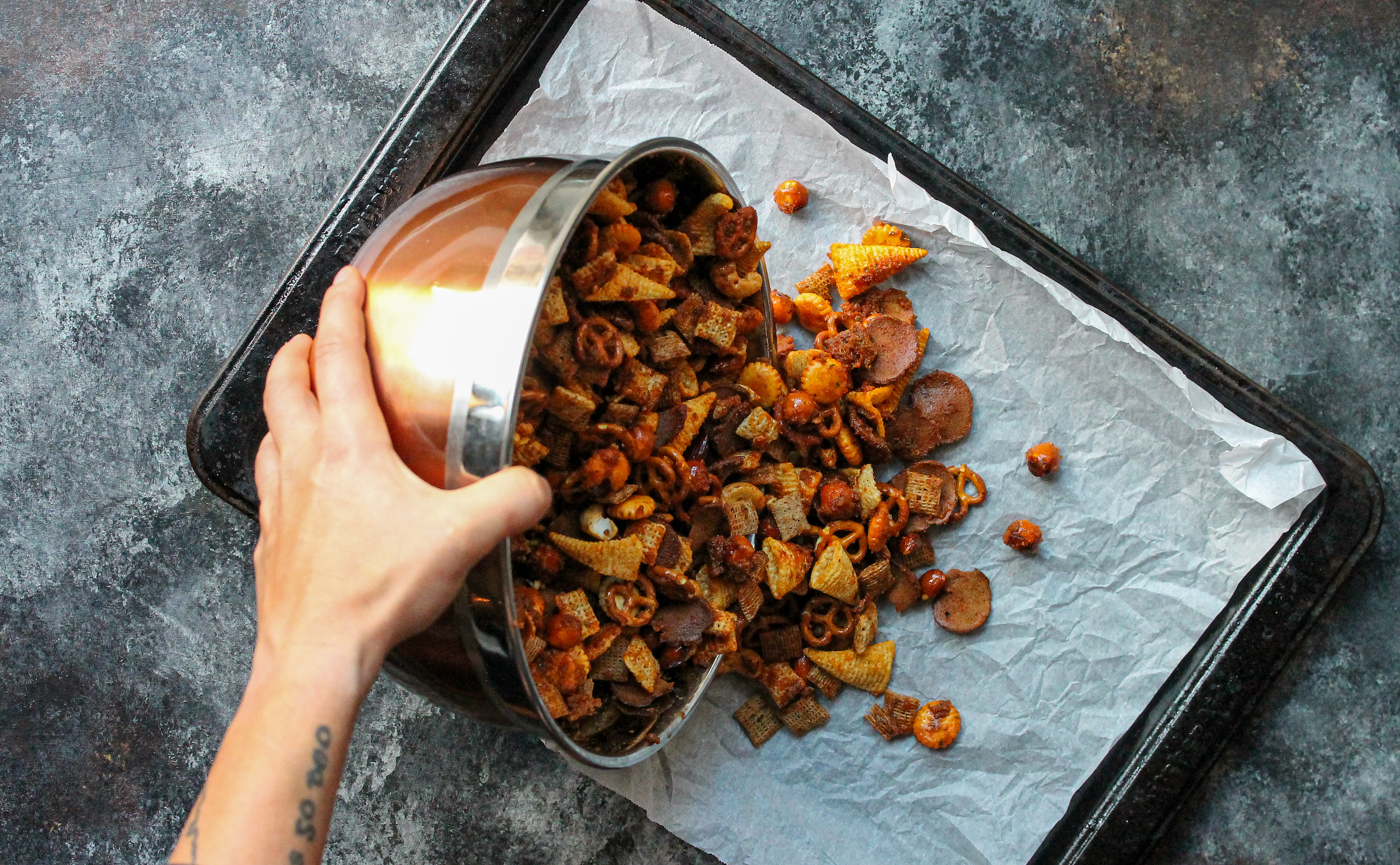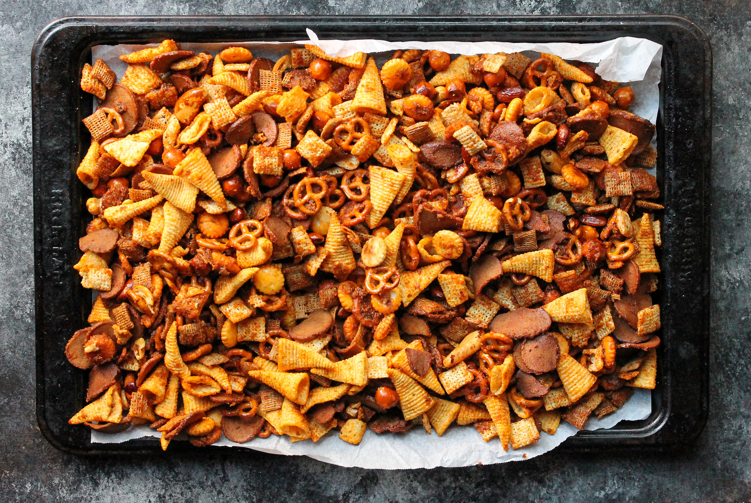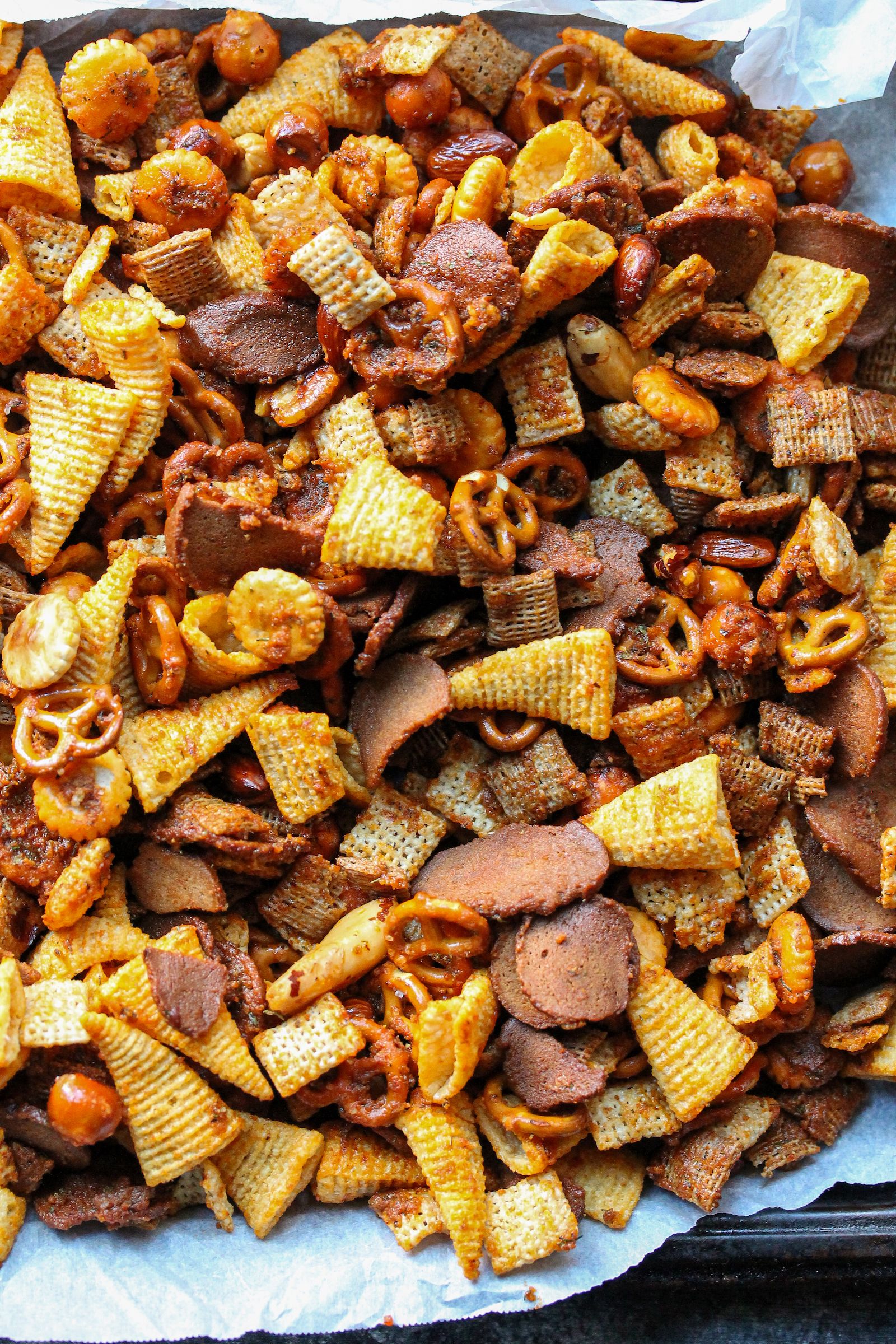 - Gently add the snack mix to the bowl, tossing to combine to seasonings and snack mix, about 3 minutes. Spread the mix evenly onto a rimmed baking sheet lined with parchment paper.