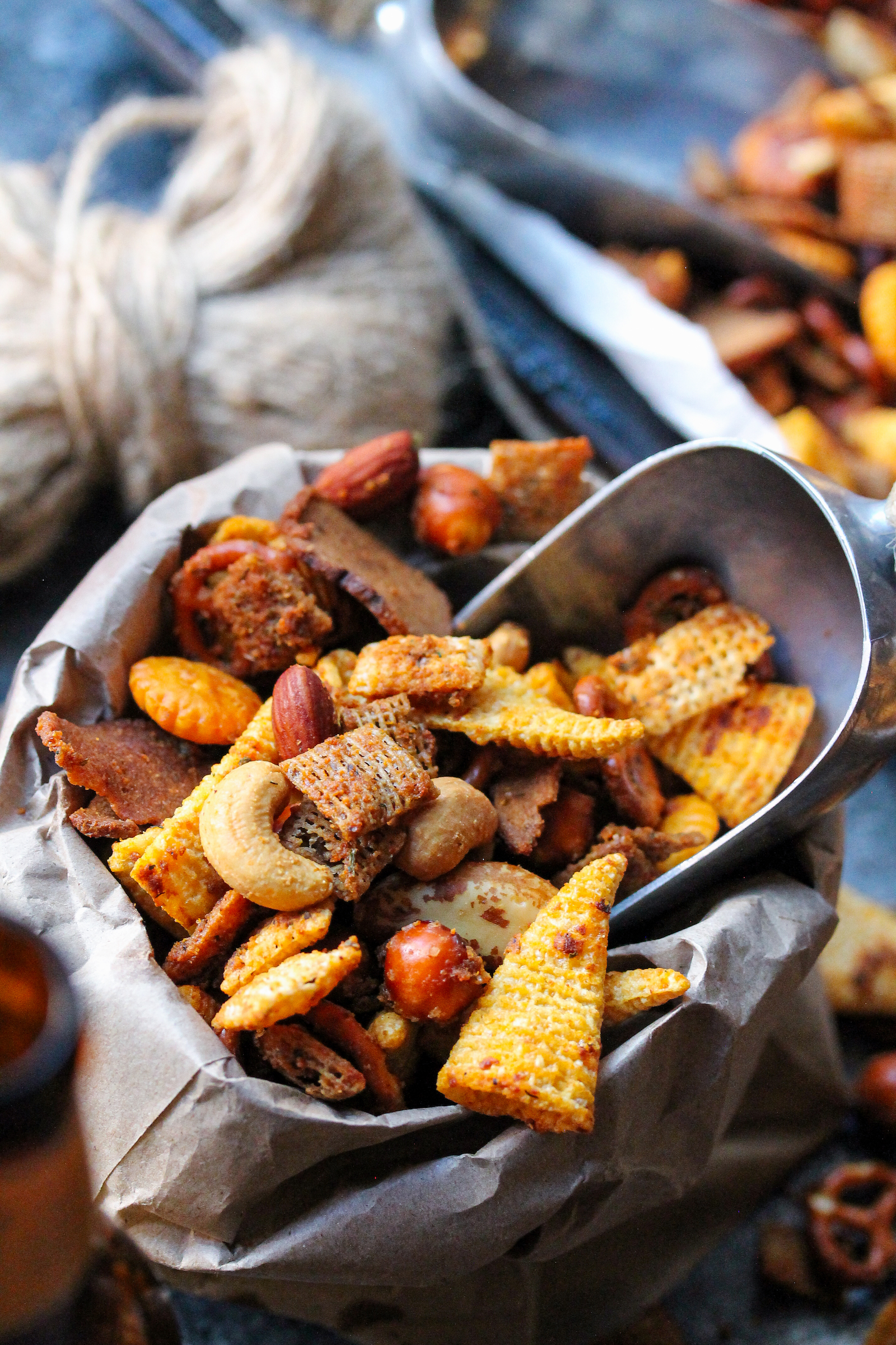 Homemade snack mix is one of my favorite things to make during this time of the year. I love making a huge batch to snack on while watching my favorite Holiday movies and lounging by the fireplace – it’s the perfect accompaniment to a glass of wine or your favorite brew, too! During Christmas, I always triple the recipe to package into cute mason jars wrapped with twine for a fun, homemade gift! Trust me when I say your friends and family will request it every year … it’s so good!