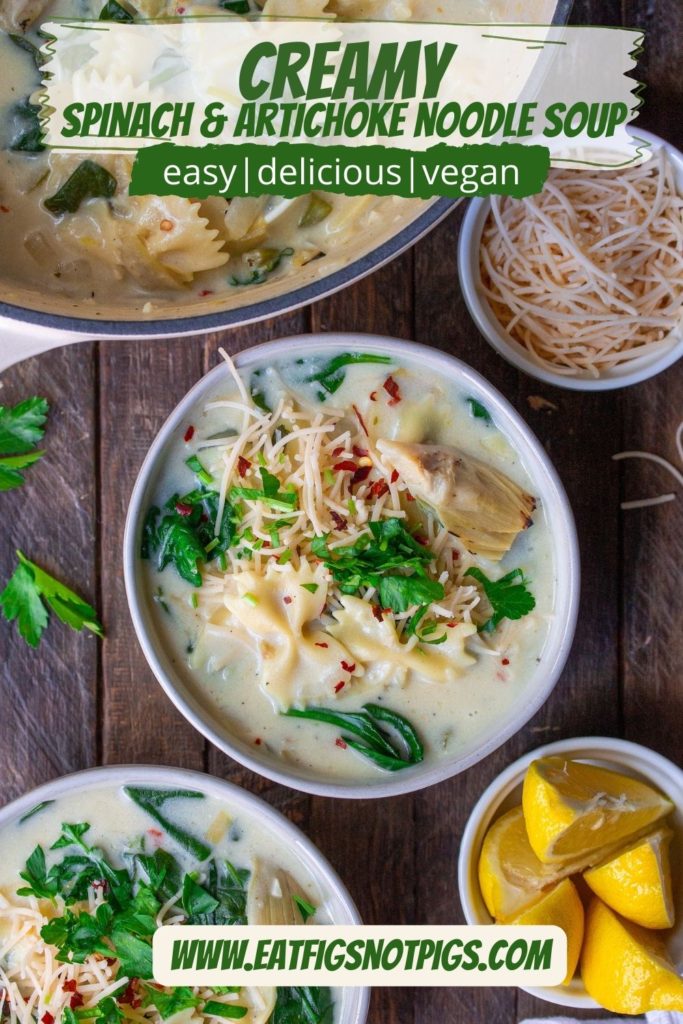 I hope you love this creamy spinach and artichoke noodle soup as much as I do! If you try this dish and enjoy it, I wanna know! Snap a photo, take a video, or make a story and post it to Instagram or TikTok, and tag me at @eat_figs_not_pigs and #EatFigsNotPigs. I love seeing your recreations of my recipes!