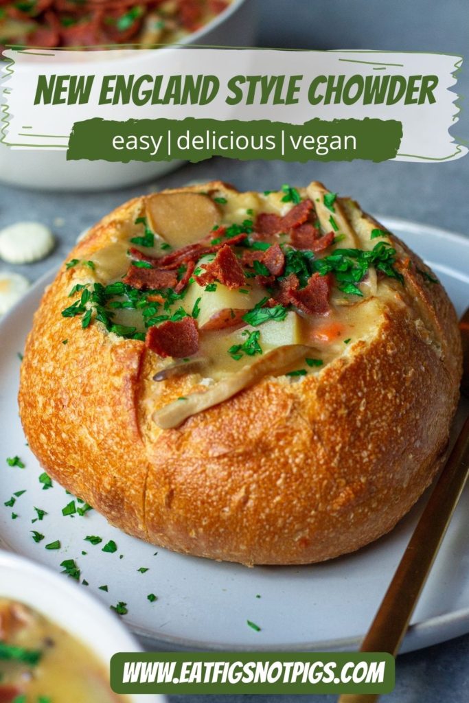 This New England – Inspired Chowder is the ULTIMATE comfort food! Rich, creamy broth is loaded with meaty mushrooms and tender potatoes. Serve in a toasted bread bowl, and top with fresh herbs for a shockingly delicious plant-based version of a classic favorite!