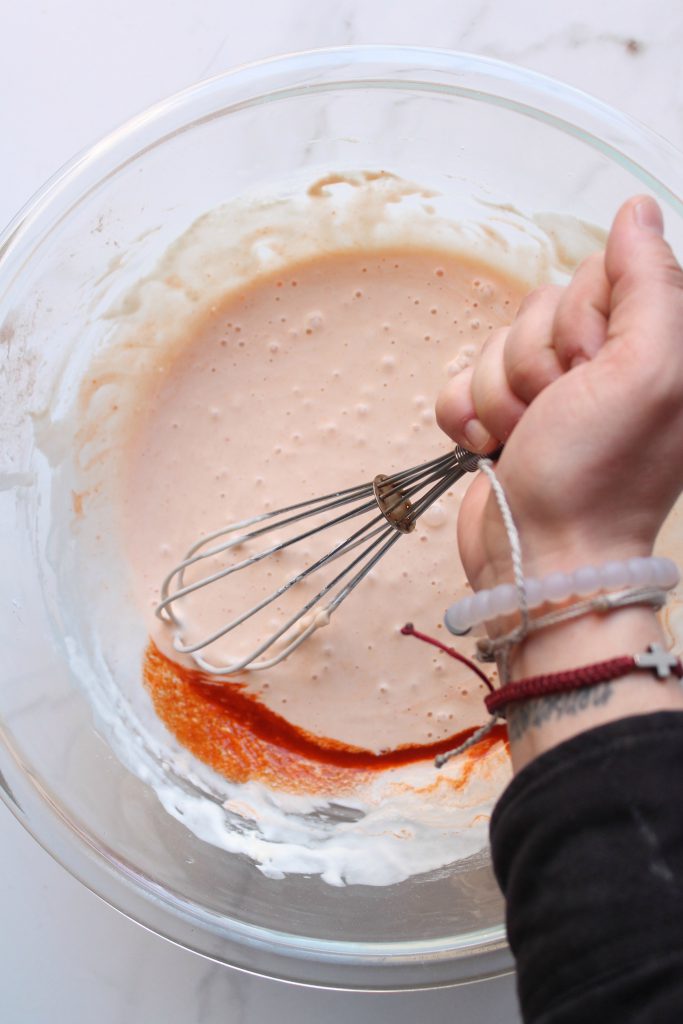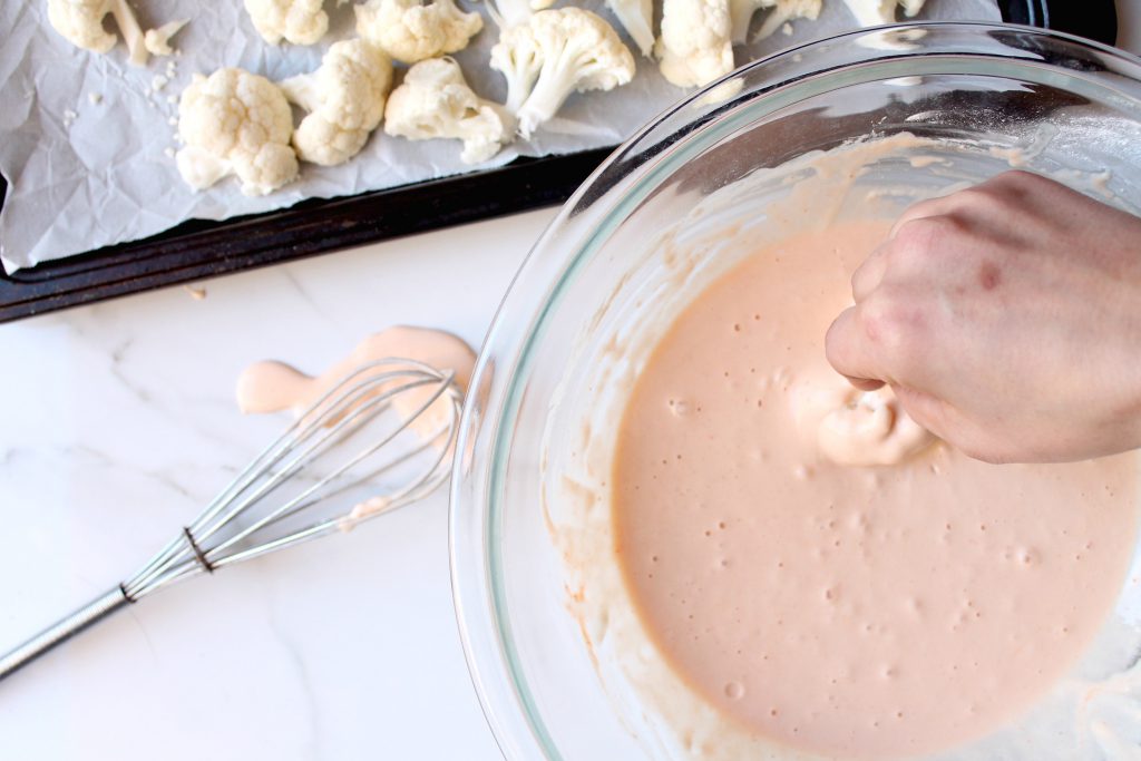 You’ll start with a coating of flour and cornstarch and then batter the cauliflower wings in a spicy tempura batter.