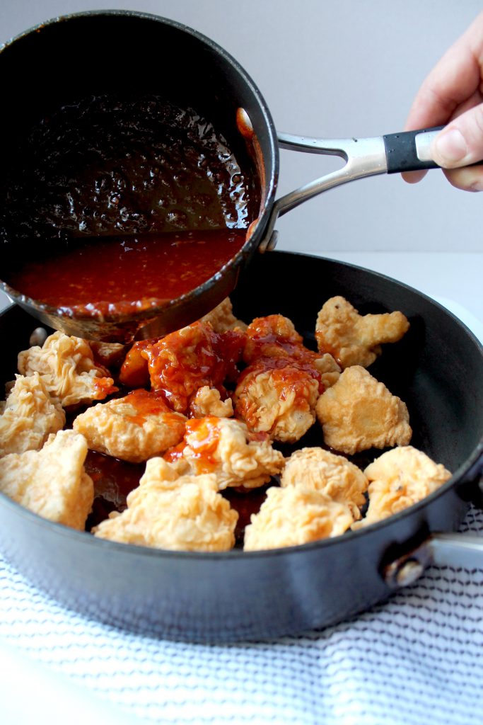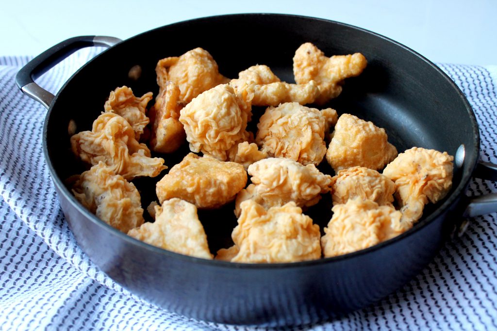 Once they are coated, they’re deep fried to a golden crisp and then tossed in the sweet chili habenero glaze.