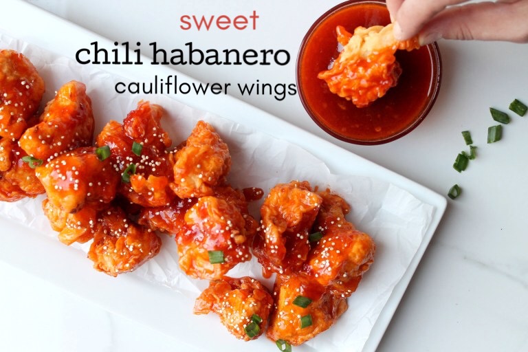 If you’re hosting a Superbowl party or attending one this year and don’t want to show up empty handed, these sweet chili habanero glazed cauliflower wings are the perfect party treat!