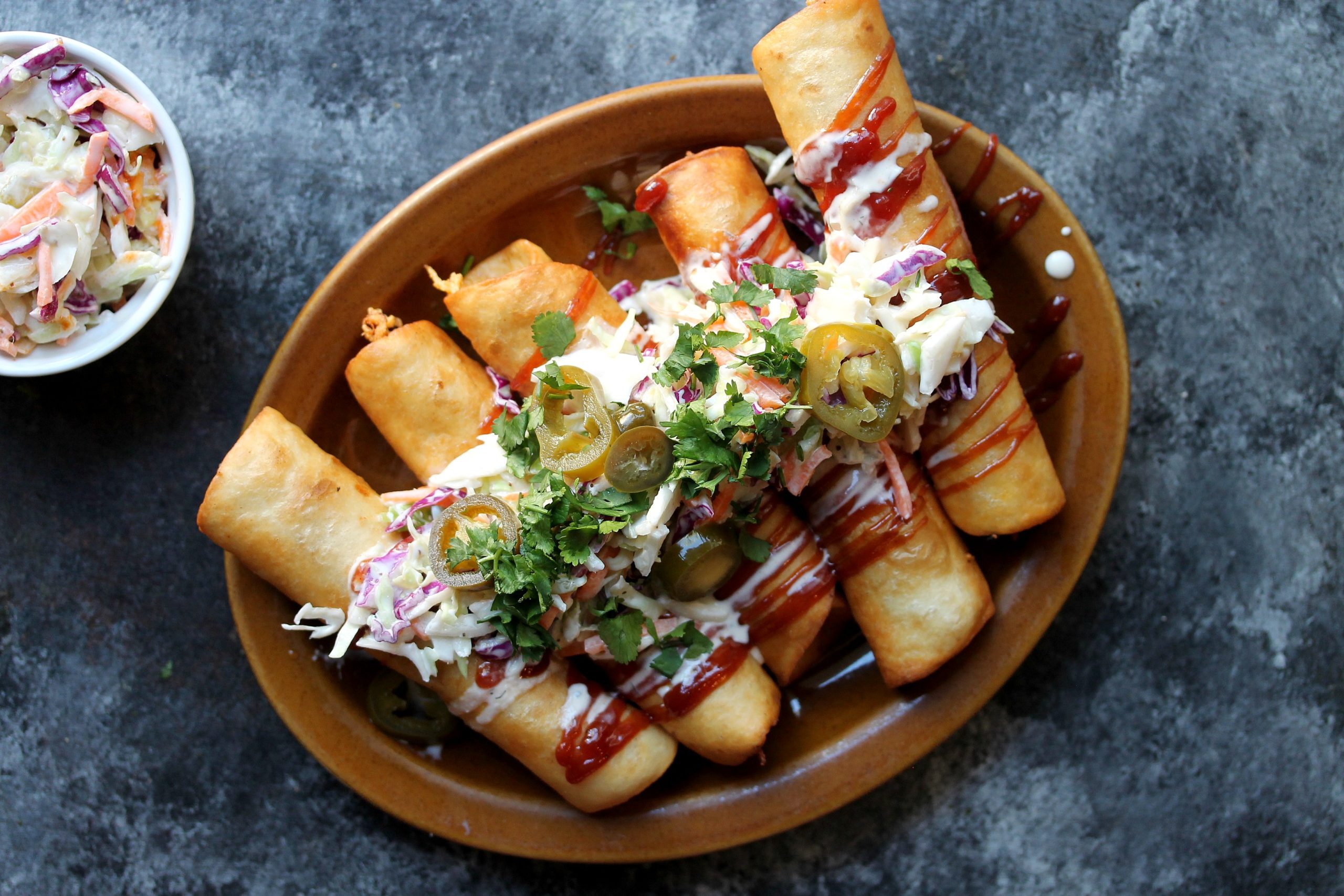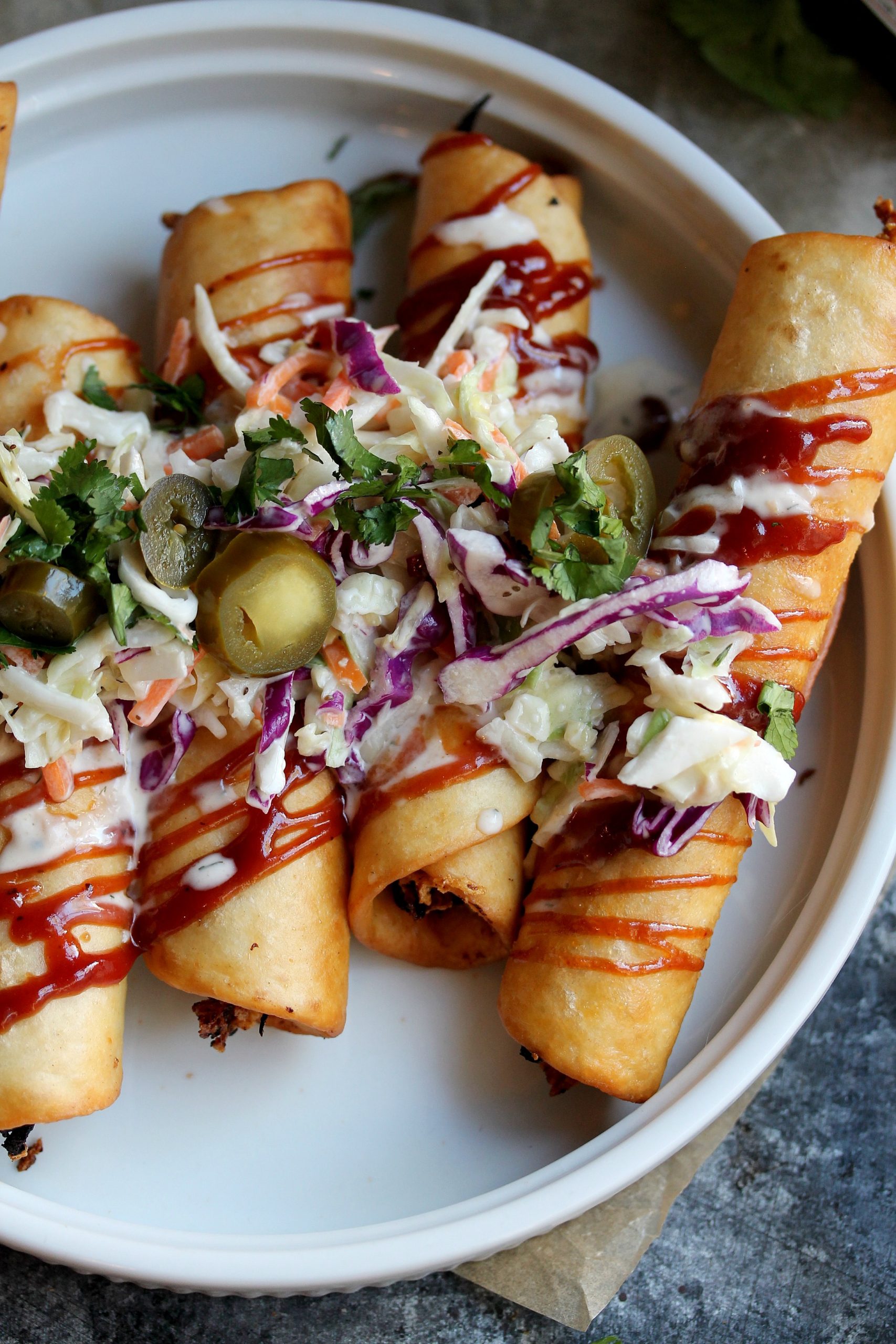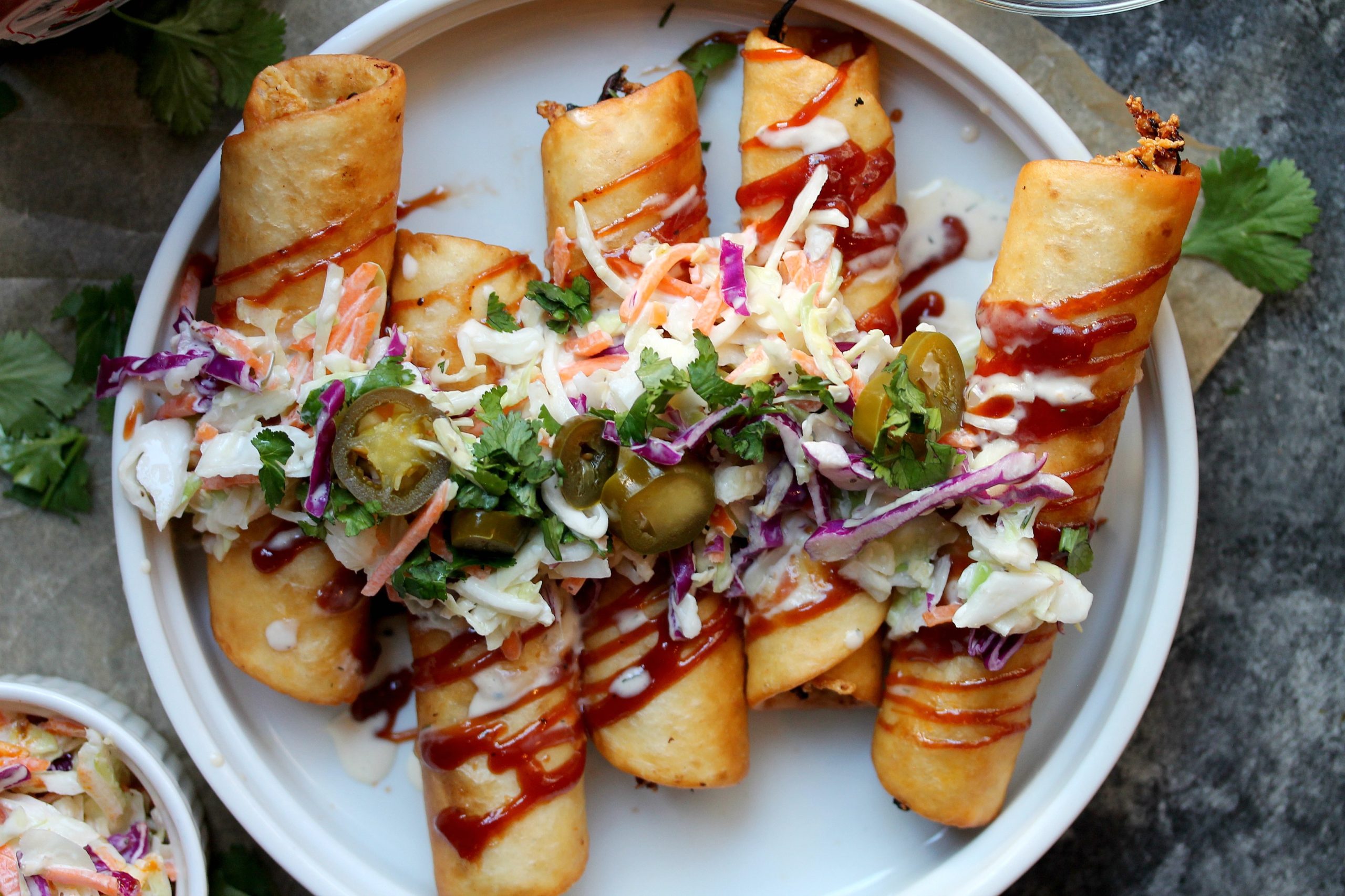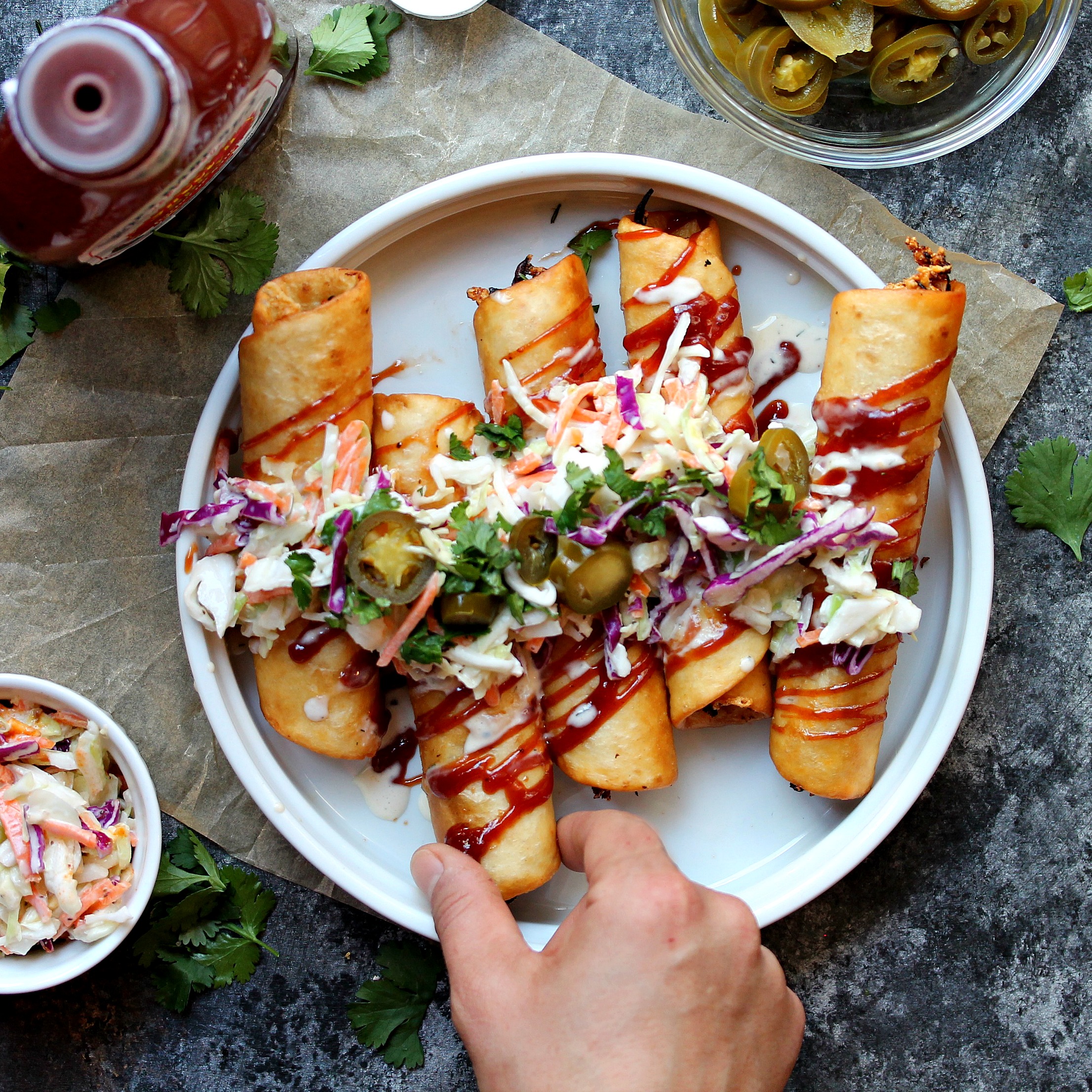 7. When ready to serve, top taquitos with coleslaw, pickled jalapeños, chopped cilantro, and a drizzle of BBQ sauce and vegan ranch.