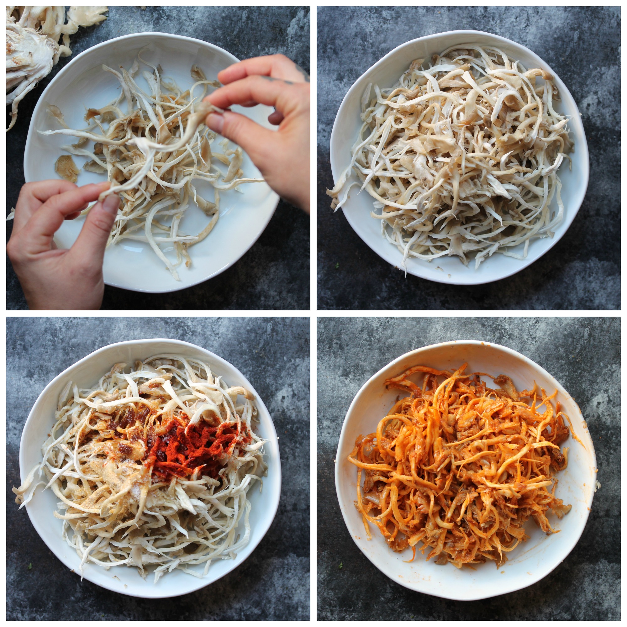 1. Shred. Using your hands or the back of two forks, shred the mushrooms until they eerily resemble shredded meat. Once the shrooms are all shredded, toss with the BBQ ‘Pork’ seasoning.