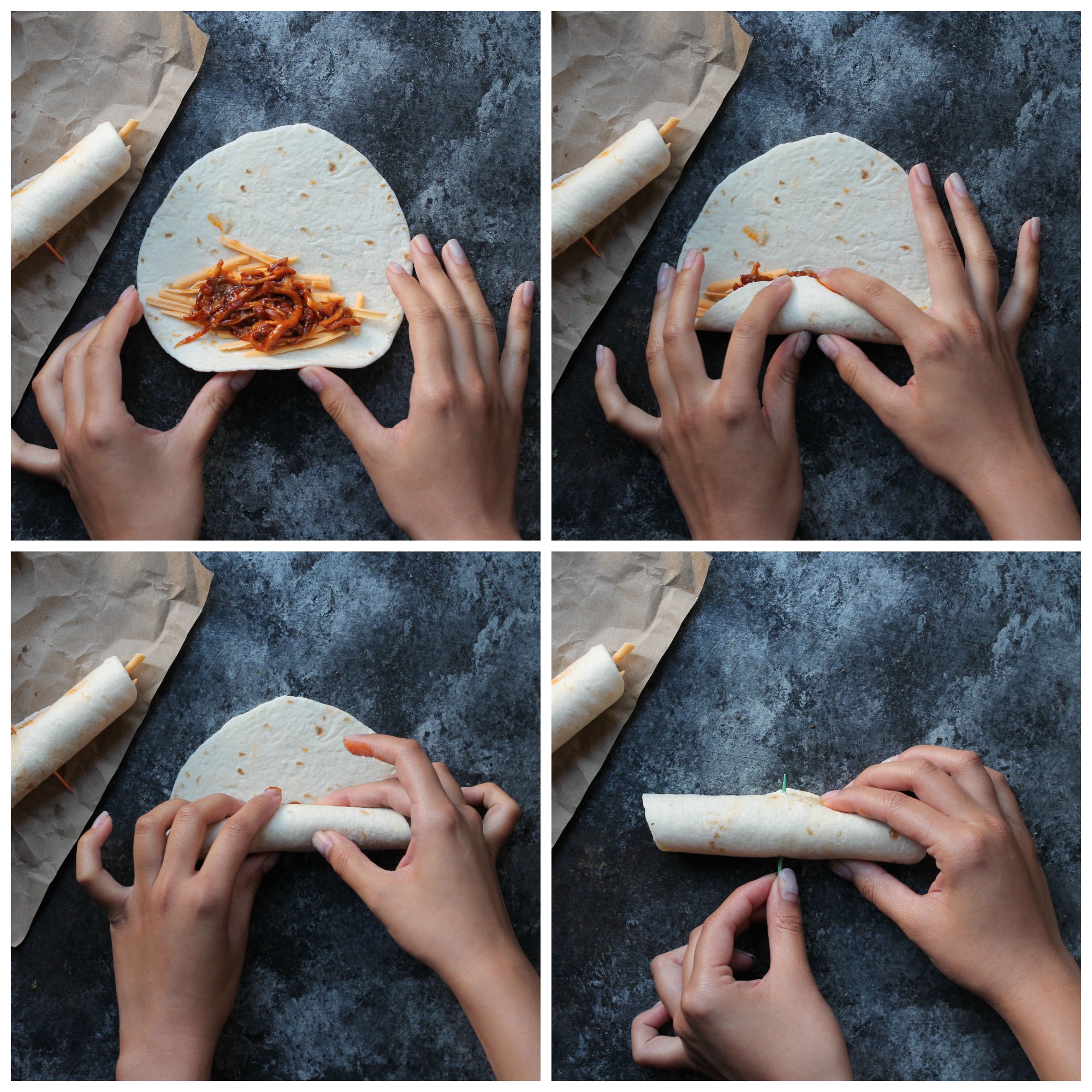 3. Roll. After you’ve cooked you’re shredded mushrooms, toss them into a large bowl with your shredded vegan cheese. Give it a good mix to combine, and start rolling! Take about 1/4 cup of the mushroom/cheese mixture and place towards the bottom half of a flour tortilla. Then, using both hands, roll tightly and secure with toothpicks. Repeat until all the filling is gone.