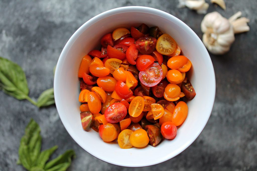 - In a bowl, combine tomatoes, 1 cup chopped basil, garlic, 2 TBS olive oil, 1 tsp salt, and ½ tsp pepper. Mix thoroughly so that all the ingredients are well incorporated. Set aside.