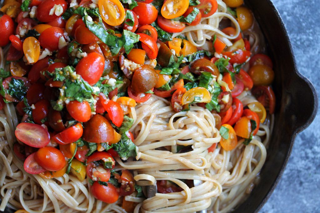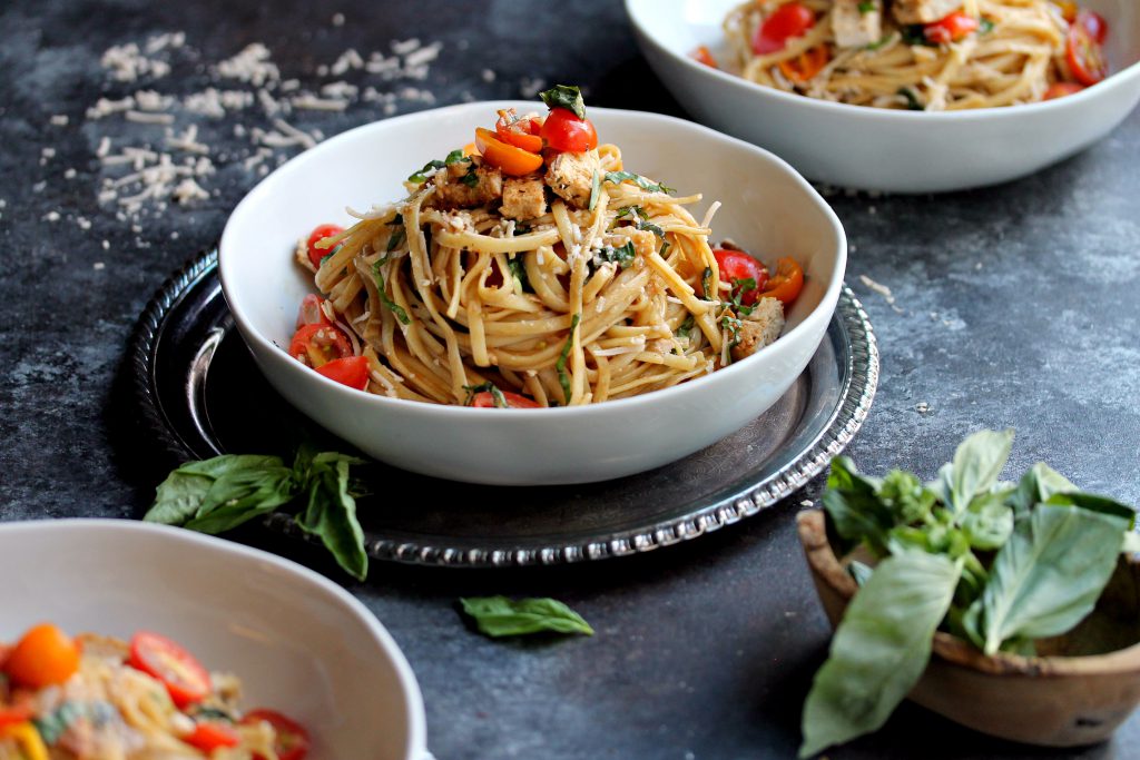 After you prepare your bruschetta mix, you just let it sit in for a few minutes to let the flavors marry. While the noodles are cooking, prepare the sauce, pan sear the vegan chicken…and voilà! All you have to do is toss all the ingredients with the cooked noodles and you’ve got a quick, seasonal, and flavorful meal in less than 30 minutes!